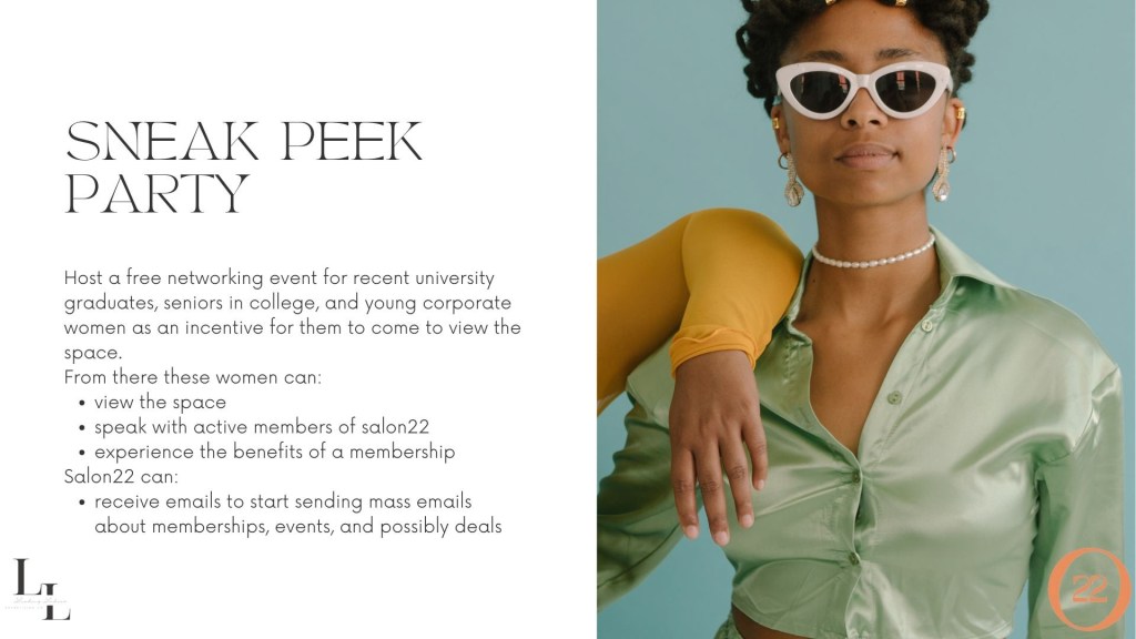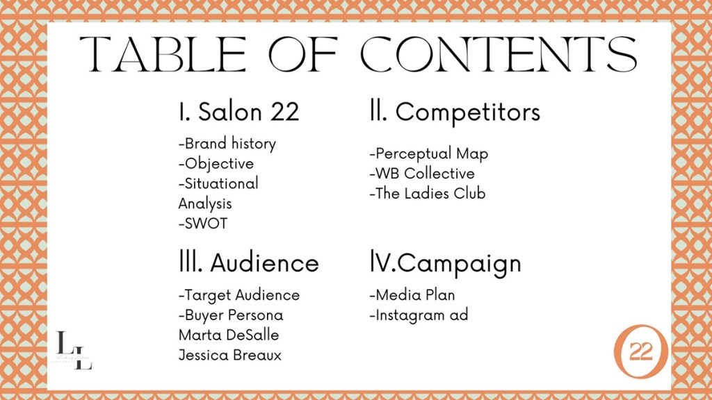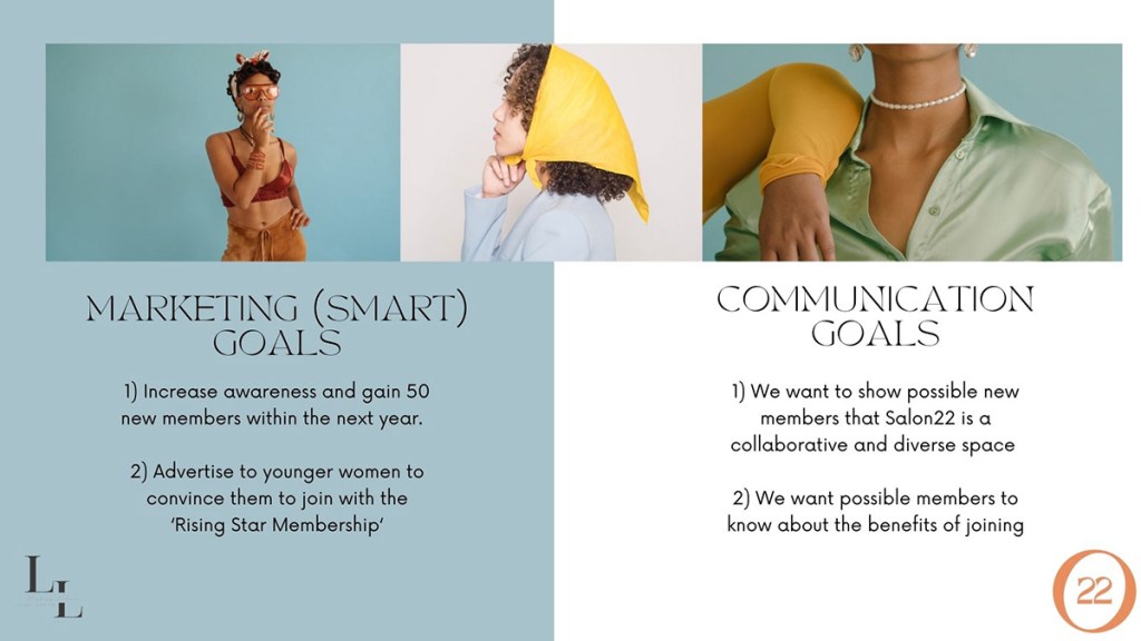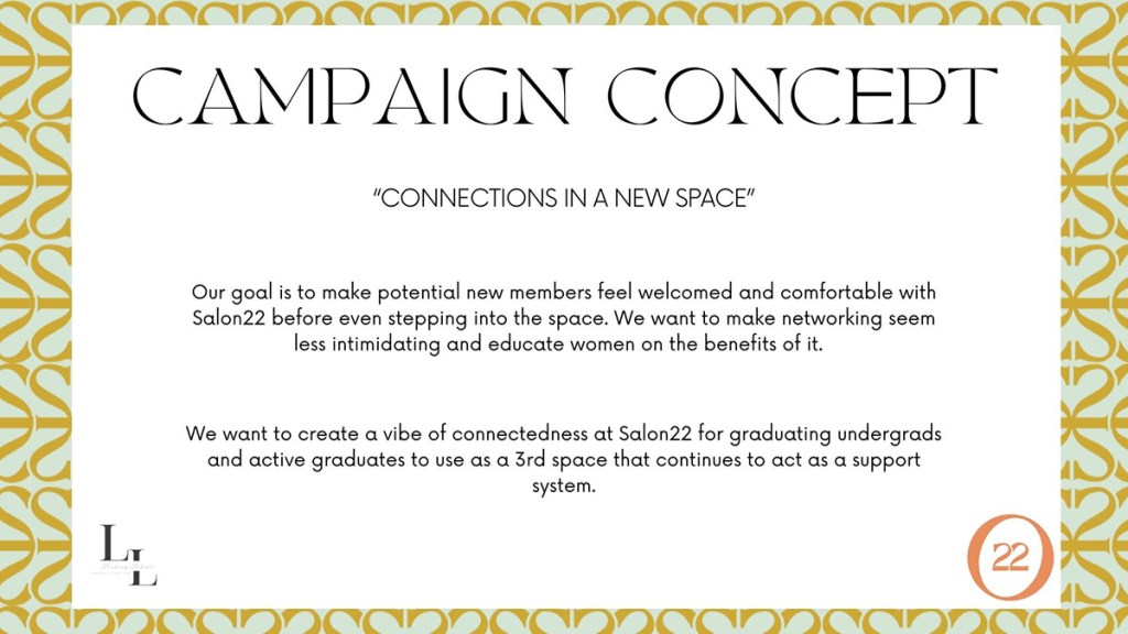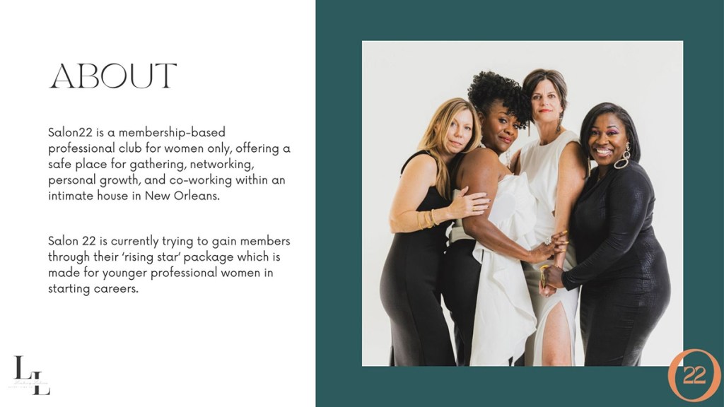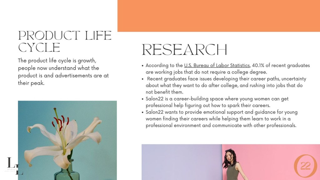 I was given the opportunity to work with a real client, Salon22, in my Advertising class. Our team, the Leading Ladies, got runner up in our ad campaign competition in 2023. We had the privilege to present in front of Salon22 founders and our peers.