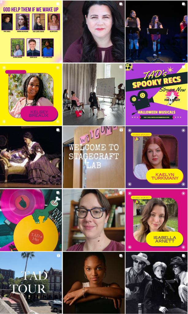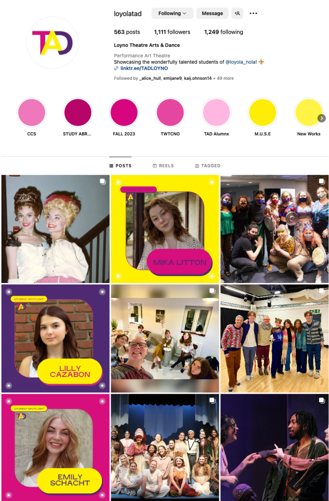 I have had multiple experiences working on social media content creation and management. For my Social Media course, I was a part of the social media team that managed the Theatre Arts and Dance Department’s socials for Loyola University New Orleans. I worked with a team of ten to create graphics, edit videos, design logos, create copy, and post on multiple social media platforms including Instagram, TikTok, Youtube, Twitter, and Facebook. I led the Instagram team in revamping their social media presence and designed the new brand kit and guidelines for the Instagram and ensured that our content fit.